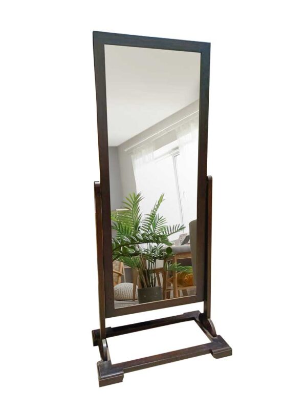 กระจกเงาสูงพร้อมขาตั้งที่มาพร้อมกับกรอบไม้สีดำที่เรียบหรู ให้คุณสามารถเห็นภาพสะท้อนของจากศีรษะจรดปลายเท้าได้อย่างชัดเจน